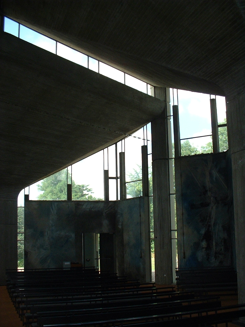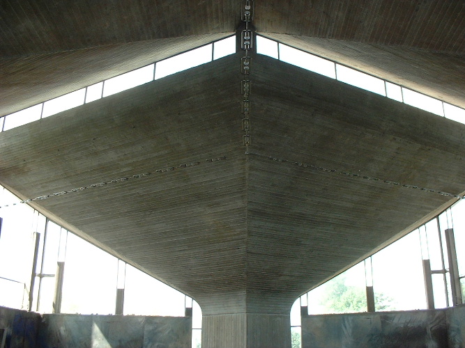 unterschiedlich hohen Pilzdächer (links einer dieser “Pilze” vom Altar aus gesehen) gegliedert. Sie ergeben durch ihren Standort einen vierteiligen Raum (drei gleichseitige Dreiecke und ein Innendreieck), der in