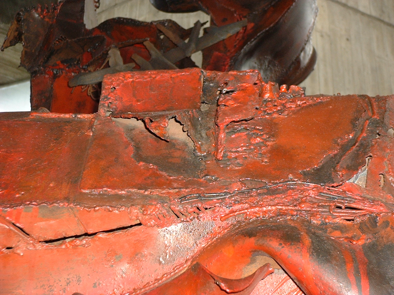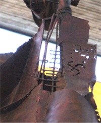 des sich nach rechts neigenden offenen Rohrteils ist mit Schweißdraht ein Hakenkreuz gelegt; ein weiteres ist seitlich weiter oberhalb zu sehen. Noch weiter oben findet man im Kreuz nach einem kompakteren Teil mit fließenden Formen ein