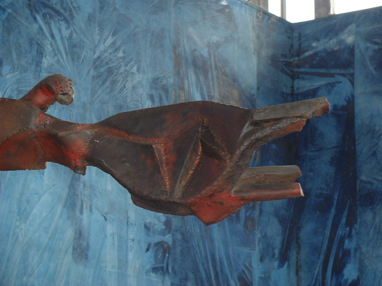 über posaunenartige Gebilde bis zur nach rückwärts geschlossenen Faust. Über der Mitte befinden sich Zacken und Spitzen als Anspielung auf die Dornenkrone. Dann gähnen den Betrachter kaminartige, offene Rohrteile an. Über dem Rohrkragen