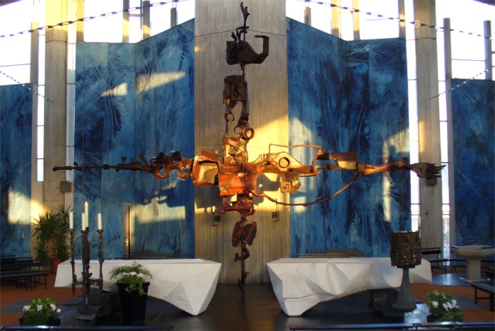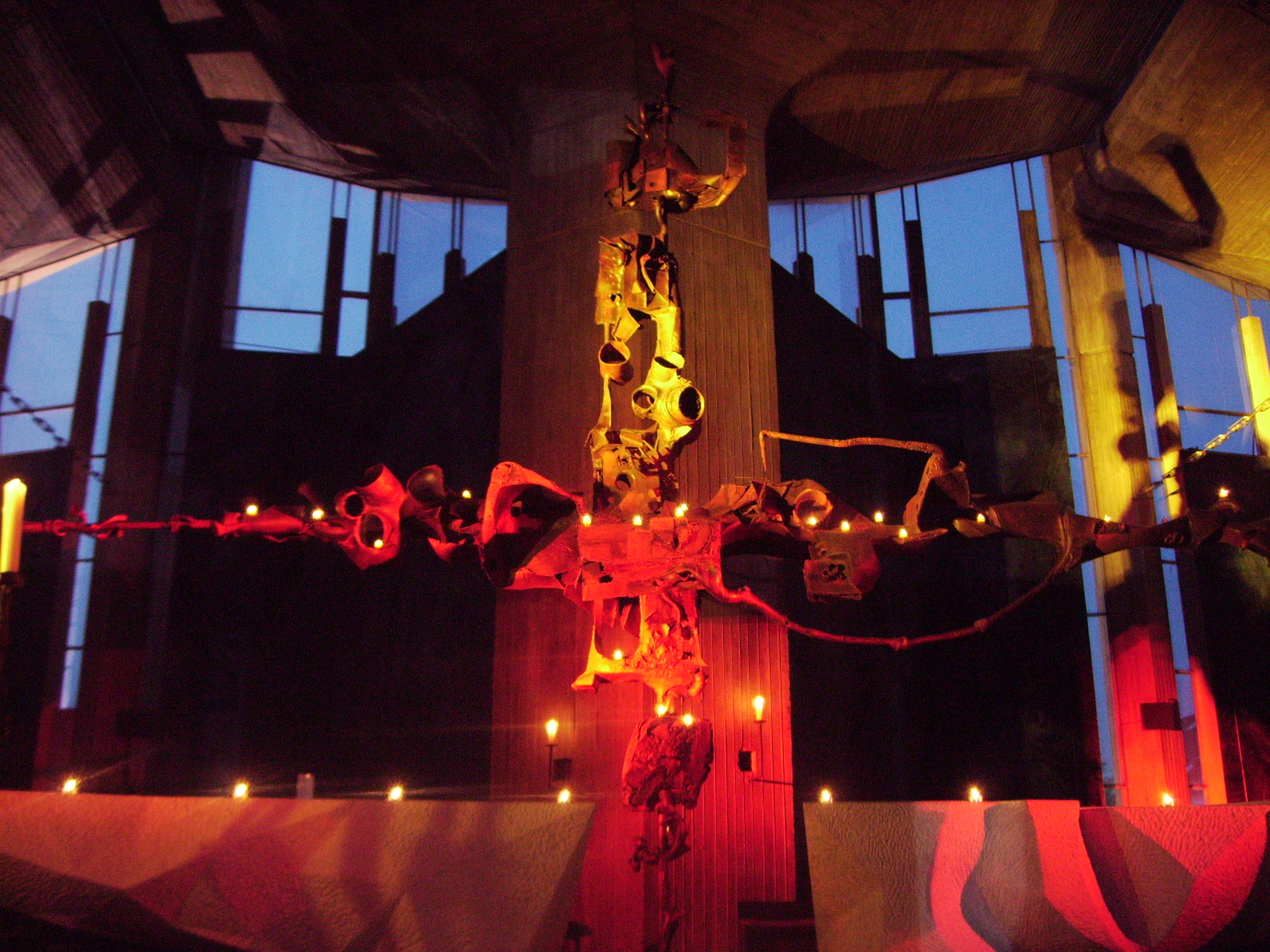 Das den Kirchenraum so stark dominierende Schrottkreuz wirkt auf viele Menschen wie die Glorifizierung von Tod und Leid. Sogar das makabre Erkennungszeichen der nationalsozialistischen Ideologie, das Hakenkreuz, wird gleich doppelt