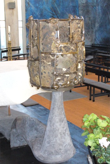 Bronzeleuchter, der aus dem Tisch des Brotes “herauswächst”. Somit entsteht eine diagonale Beziehung zwischen dem Tisch des Brotes und dem Tabernakel sowie dem Tisch des Wortes und dem Leuchter. Christus wird als